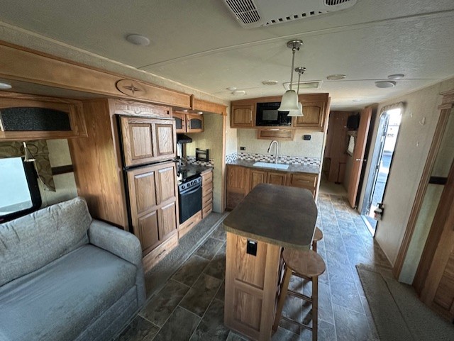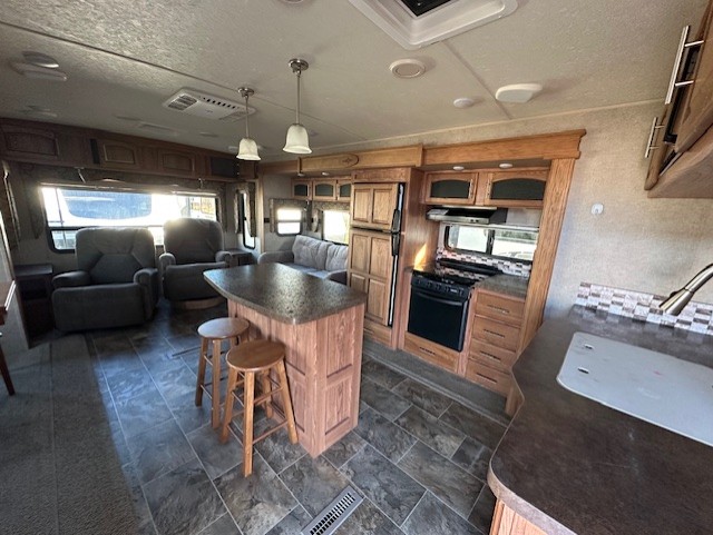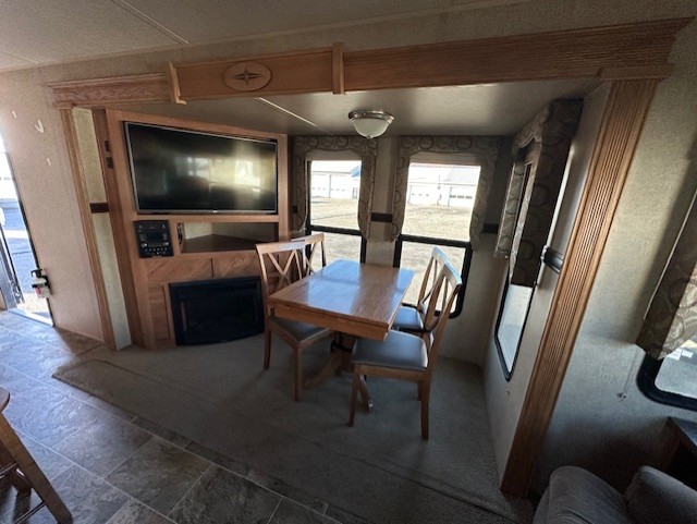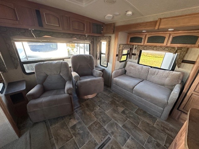 Great layout. Three slide outs, tons of storage, kitchen island with bar stools, dual recliners, fireplace, power awning, power tongue jack. New tires, New patio awning fabric, New slide out cover fabrics. Great condition.
