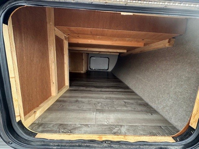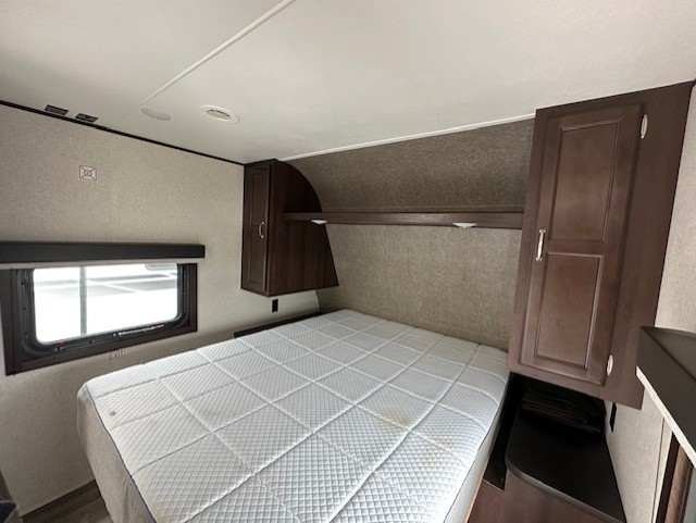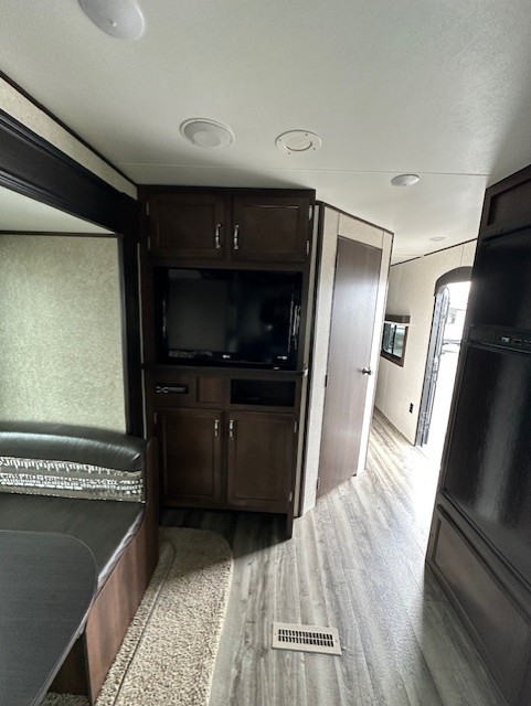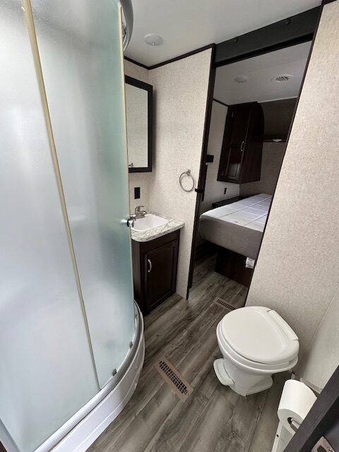 Rear living room, side isle bath with corner shower, front queen bed